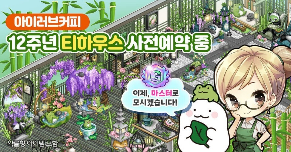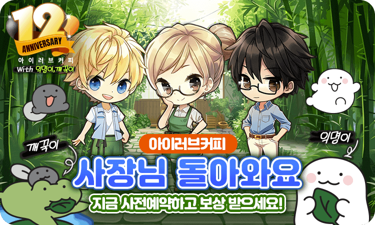 아이러브커피가 12주년을 기념한 대형 업데이트를 진행합니다. 12주년 업데이트 콘텐츠로는 대나무 숲 속의 고즈넉한 전통 찻집 '티하우스', 70레벨부터 그랜드 마스터에 도전할 수 있는 '마스터 레벨'이 추가되어 고레벨 이용자들도 보다 다채로운 재미를 느낄 수 있게 됩니다. 또한, 콜라보의 주인공으로 깨꾹이와 익명이가 등장해 함께 12주년을 축하한다고 합니다.