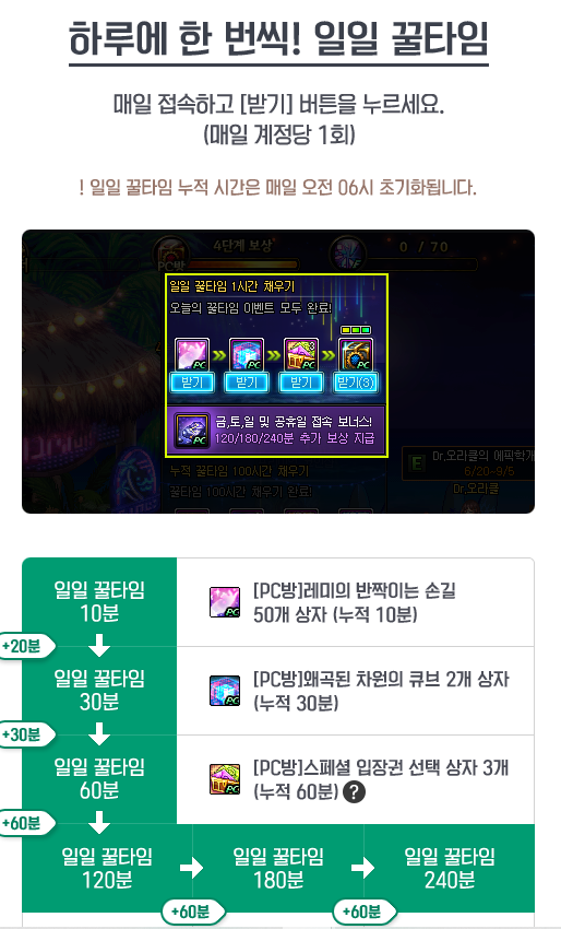 먼저, 일일 꿀타임 보상은 하루 동안 PC방에서 총 240분 동안 던파를 플레이할 경우 제공됩니다. 단계별로 보상이 지급되며, 레미의 반짝이는 손길 50개, 왜곡된 타원의 큐브 2개 상자, 스페셜 입장권 선택 상자 3개, 행운의 상자 1~3단계를 받을 수 있습니다. 특히 행운의 상자에서는 신비한 열쇠 꾸러미 1개가 고정적으로 주어지며, 일정 확률로 정제된 미스트, 힘의 정수, 짙은 심연의 편린 장비 선택 상자, 왜곡된 차원의 큐브 등이 추가로 제공됩니다.