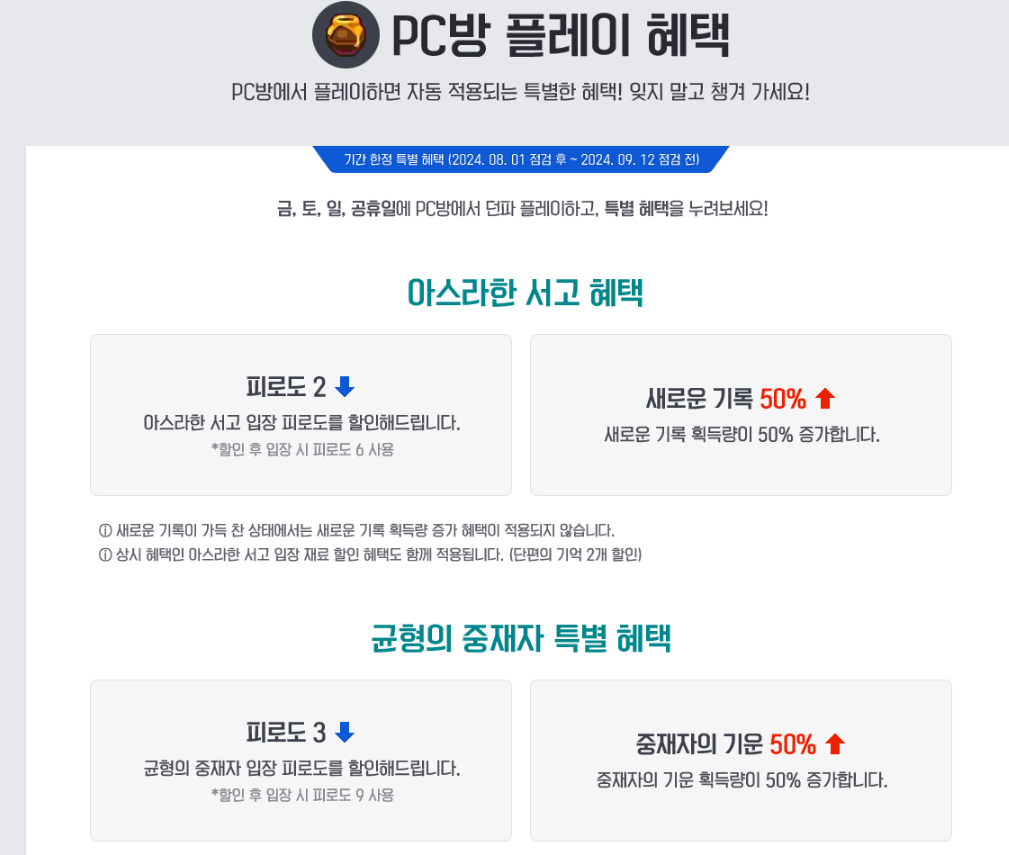 PC방에서 던파를 즐기는 유저들을 위한 추가 혜택도 제공됩니다. PC방 플레이 혜택으로는 아스라한 서고 입장 피로도 2 감소, 새로운 기록 획득량 50% 상승, 균형의 중재자 입장 피로도 3 감소, 중재자의 기운 획득량 50% 증가 등 게임 플레이에 도움이 되는 여러 혜택이 주어집니다.
