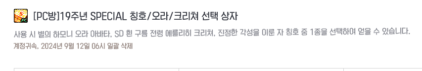 19주년 스페셜 상자의 구성품은 매우 매력적입니다. 오라 아이템은 공격력 증폭 6%, 버프력 증폭 4%, 모든 속성 강화 40, 물리·마법·독립 공격력 50, 힘·지능·체력·정신력 100, 물리·마법 크리티컬 히트 5%, 마을 이동속도 증가 10%, 모험가 명성 645 등 강력한 옵션을 자랑합니다. 크리쳐 'SD 흰 구름 전령 에를리히'와 칭호 옵션도 상당히 유용한데, 특히 칭호는 공격력 증폭 18%, 버프력 증폭 2% 등 다양한 스탯을 강화해 줍니다. 다만, 칭호는 플래티넘 등급이 아니기 때문에, 가능하다면 오라를 선택하는 것이 더 유리할 수 있습니다.