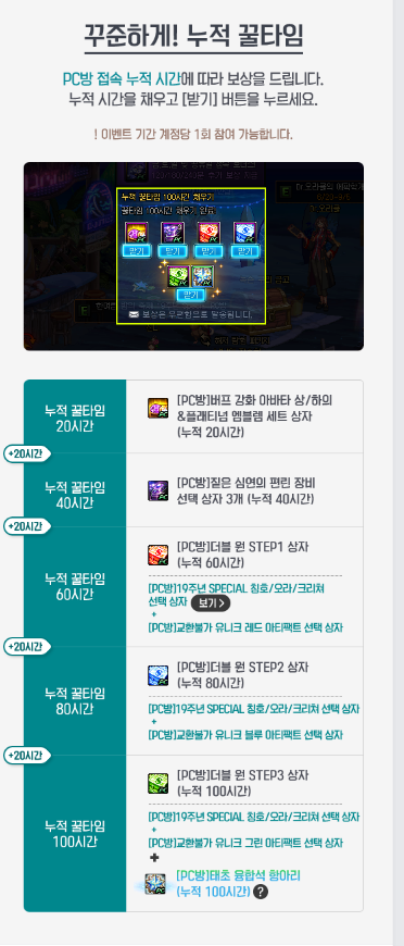 이번 이벤트에서 가장 주목할 만한 것은 바로 누적 꿀타임 보상입니다. 누적 꿀타임은 PC방에서 던파를 20시간 동안 플레이할 때마다 제공되며, 총 100시간까지 다양한 보상을 받을 수 있습니다. 20시간을 달성할 때마다 버프 강화 아바타 상·하의와 플래티넘 엠블렘 세트 상자 등을 획득할 수 있으며, 60시간, 80시간, 100시간에는 '더블 원 STEP 상자'가 추가로 지급됩니다. 이 상자에서는 19주년 스페셜 칭호, 오라, 크리쳐 선택 상자와 유니크 아티팩트 선택 상자 등을 얻을 수 있습니다.