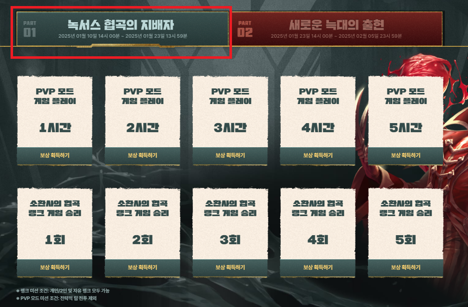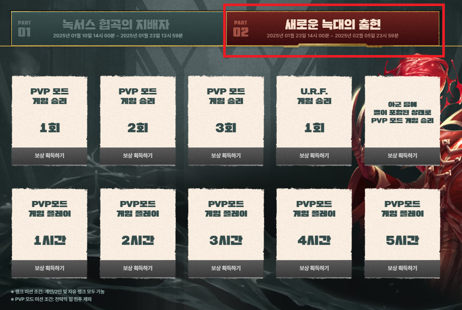 PvP 모드에서 1시간 플레이 (최대 5시간, 총 5개 미션) - 소환사의 협곡 랭크 승리 미션
