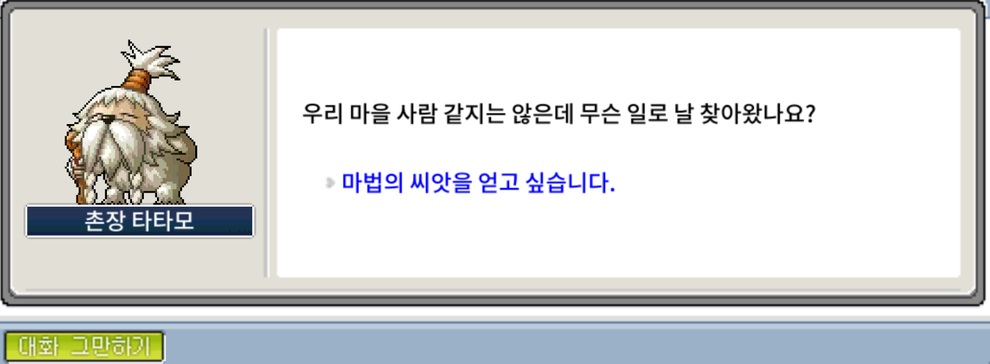 마법의 씨앗 얻는 법: 리프레 마을 중앙에 있는 촌장 타타모에게 말을 걸면 마법의 씨앗을 구매할 수 있습니다. 처음에는 개당 3만 메소라는 가격이지만, 타타모의 '마을을 위한 행동(전리품 교환)' 퀘스트를 반복 수행하면 점차 저렴하게 구매할 수 있습니다.