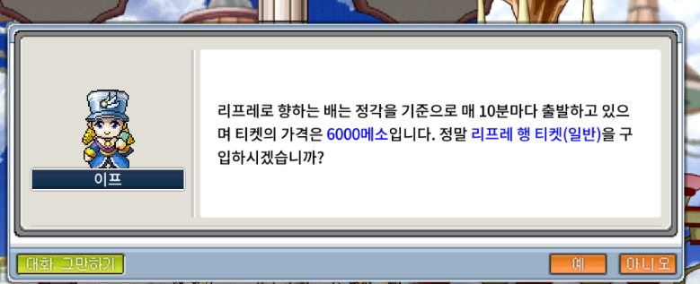 티켓 가격은 6,000메소이며, 매 10분마다 출발합니다.