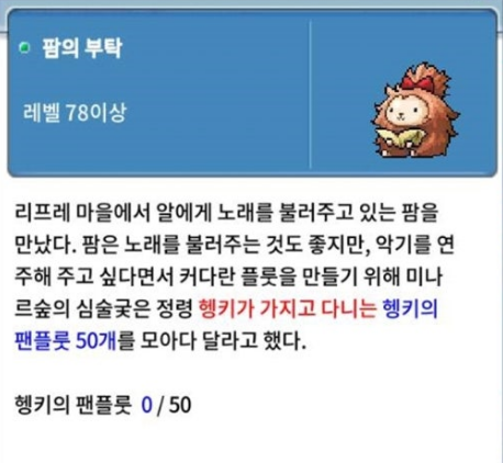 - 내용: 헹키가 사용하는 '팬플룻' 아이템 50개를 모아 팜에게 전달해야 합니다.