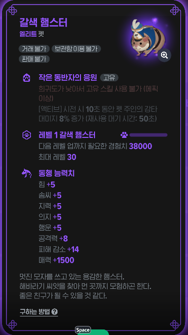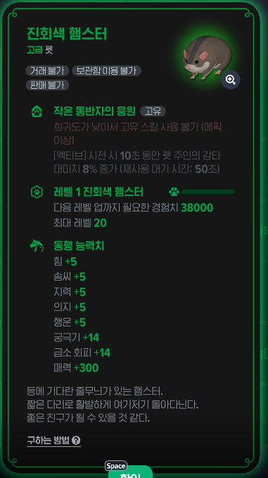 그리고 마지막으로 에픽 등급 골든 햄스터! ‘스킬 위력’과 ‘빠른 스킬’이 주요 능력치지만, 딱히 성능형 펫은 아닙니다. 그래도 외형 하나만큼은 역대급 귀여움입니다.