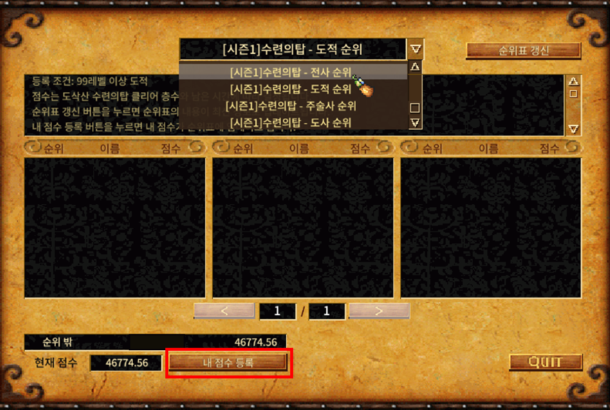 순위 등록: 수련 순위는 순위 페이지에서 직접 등록해야만 점수가 반영됩니다. 미등록 시 점수가 반영되지 않습니다.