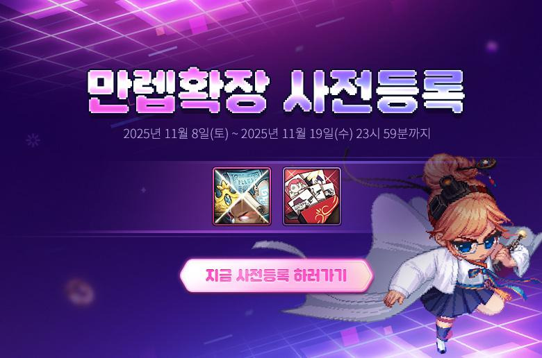 업데이트 기념으로 사전 등록 이벤트도 진행됩니다. 참여자 전원에게는 마스터 계약 30일과 만렙 확장 기념 스티커 상자(5종)가 지급됩니다.