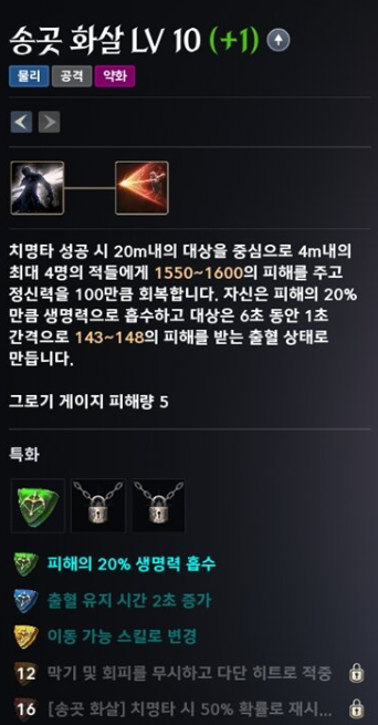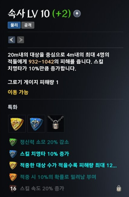 45레벨 이후 특화 구간 이때부터는 스킬 레벨에 따른 특성(특화) 효과가 열리며 캐릭터가 급격히 강해집니다. 아이온2의 스킬은 8레벨 12레벨 16레벨마다 강력한 추가 옵션이 붙습니다.