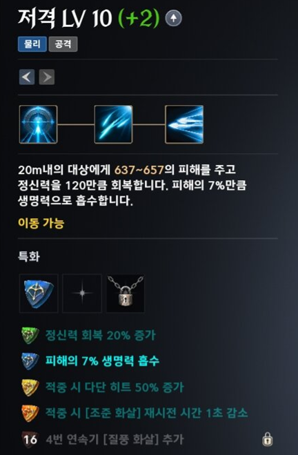 8레벨에서는 데미지 상승이나 속도 증가를 선택할 수 있고 12레벨이 되면 재사용 대기시간 감소나 치명타 데미지 증가 같은 핵심 옵션이 열립니다. 우리가 목표로 해야 할 것은 주력 스킬인 저격과 속사를 어떻게든 12레벨 이상으로 만드는 것입니다. 16레벨에 도달하면 평타가 웬만한 스킬보다 강력해지는 기현상을 목격하게 될 것입니다.