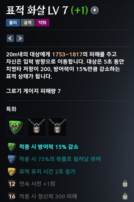 표적 화살 적중 시 방어력을 감소시키거나 치명타 저항을 낮춥니다. 딜 사이클을 시작하기 전에 먼저 꽂아 넣으면 이후 들어가는 저격과 속사의 데미지가 뻥튀기됩니다. 필수로 마스터해야 할 스킬 중 하나입니다.