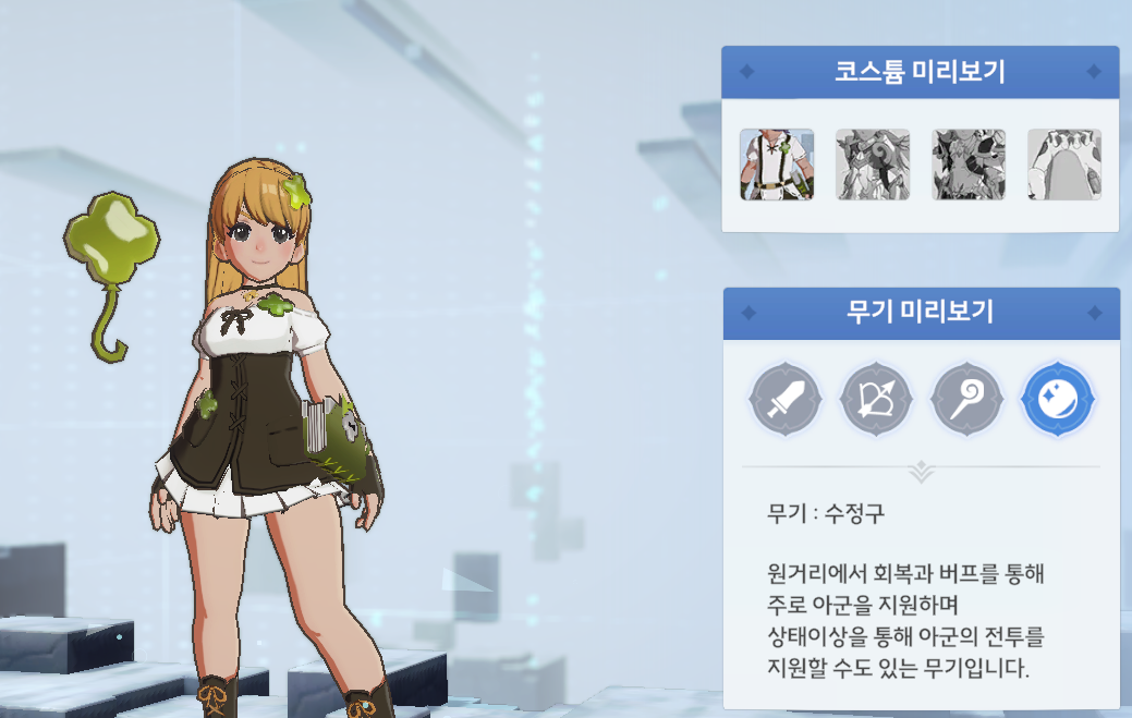캐릭터 생성 시 무기를 선택하는 단계에서 ‘수정’ 무기를 고르면 곧바로 힐러 역할을 수행할 수 있습니다.
