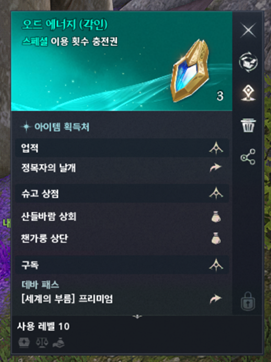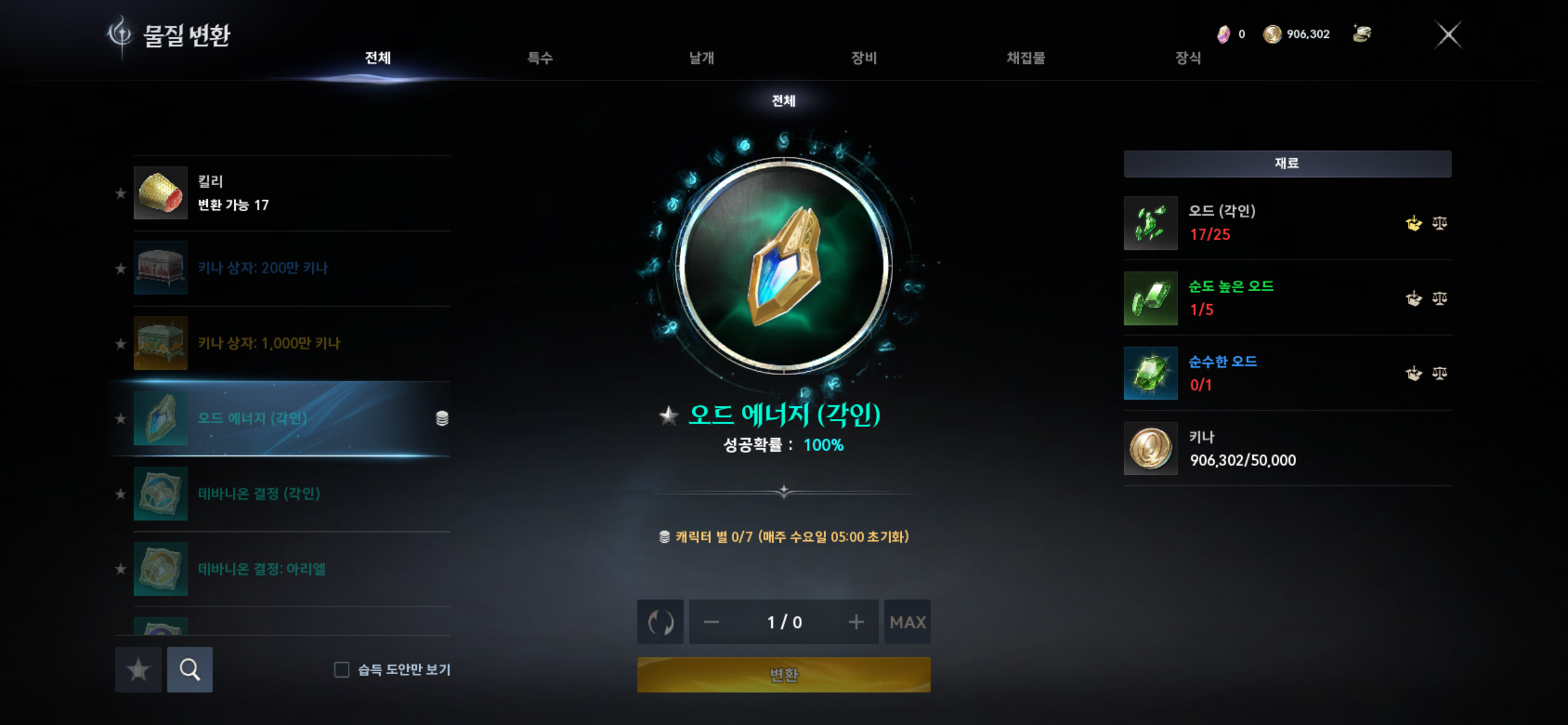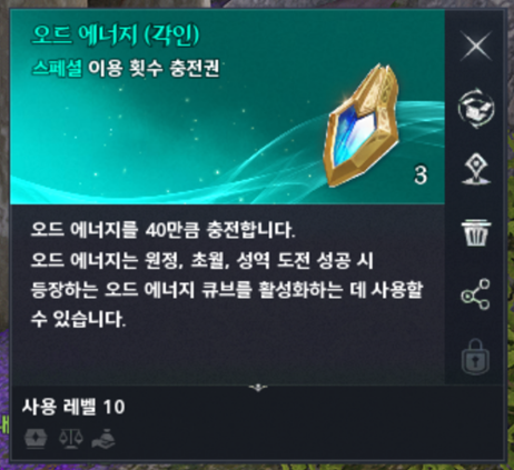 획득 방법: Alt+h를 눌러 물질 변환 메뉴로 진입, 특수 탭에서 오드 에너지 각인 아이템을 제작합니다.