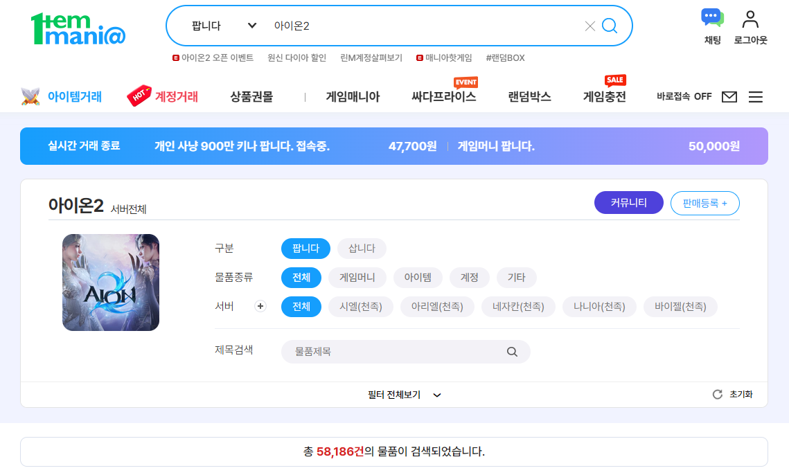 아이온2 거래소 이용 조건인 월정액 멤버십 없이 키나를 모으는 '쌀먹' 유저들에게도, 안전한 아이템 거래와 계정 판매를 위한 아이템매니아는 선택이 아닌 필수 플랫폼입니다.