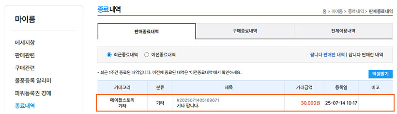 모든 과정이 완료되면 거래는 마이룸 > 종료내역에서 확인하실 수 있습니다.