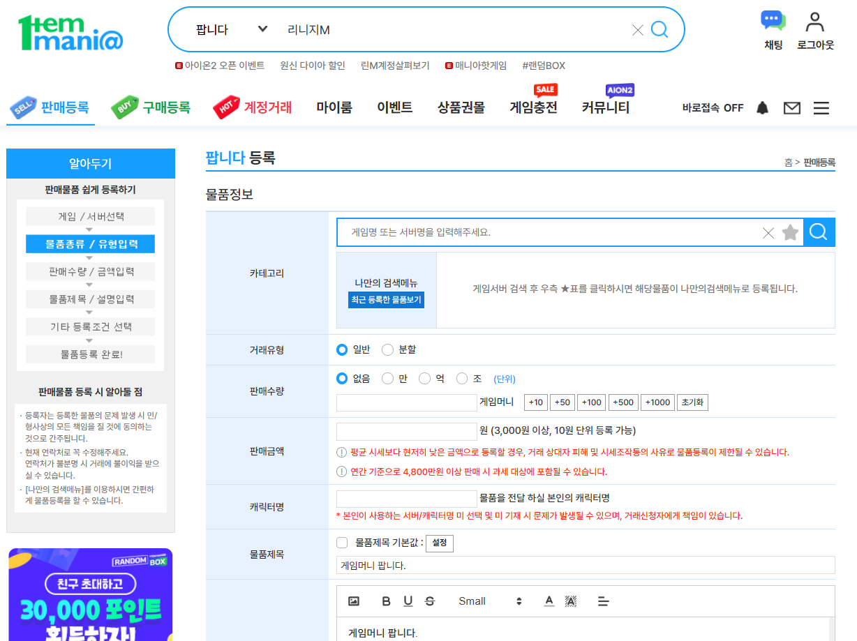 ✔ 계정·아이템 판매등록 방법 (아이템매니아 기준)