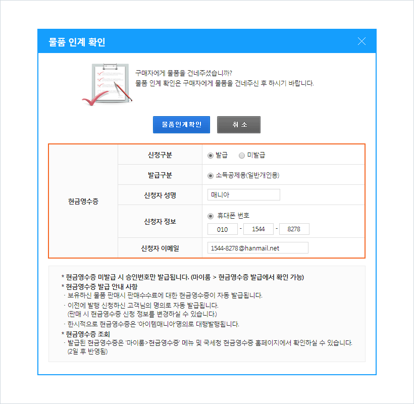 전달 후 물품인계확인 클릭
