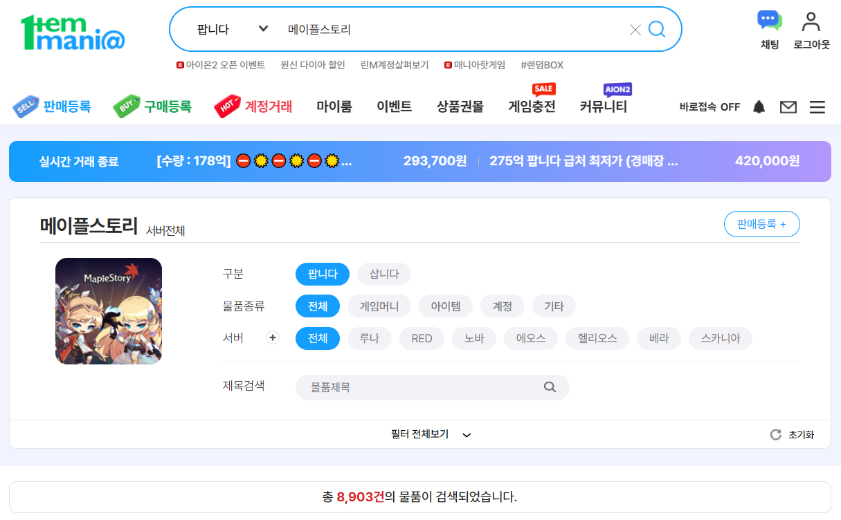 메이플스토리는 해가 지나도 여전히 활발한 거래가 이루어지는 게임입니다. 장비 세팅, 메소 구매, 계정 정리 등 다양한 목적을 가진 유저들이 시세를 확인하고 안전하게 거래하기 위해 선택하는 플랫폼은 대부분 아이템매니아로 모이고 있습니다.