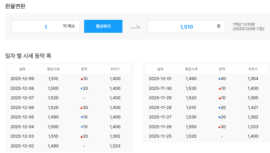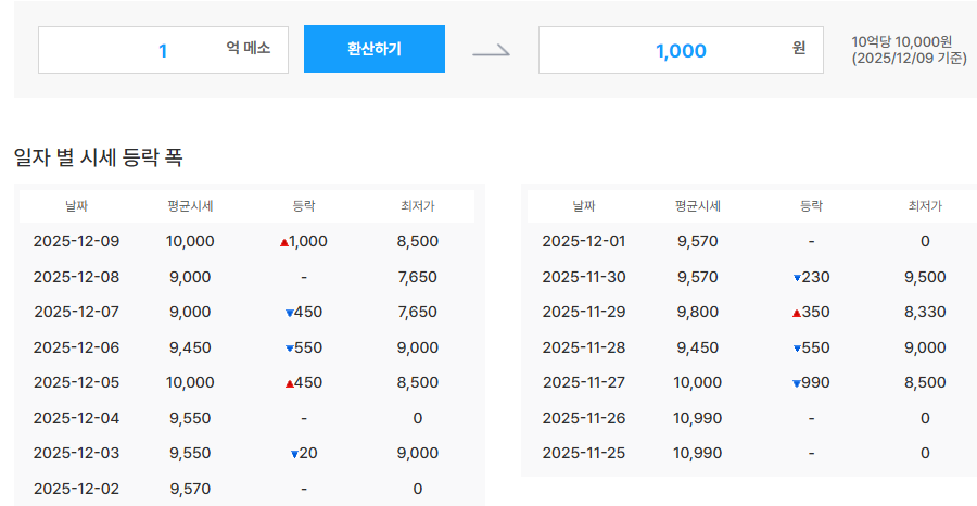 | 메이플랜드 로나 아르테일 서버의 메소 게임 재화 시세 비교 (0) | 2025.12.19 |
