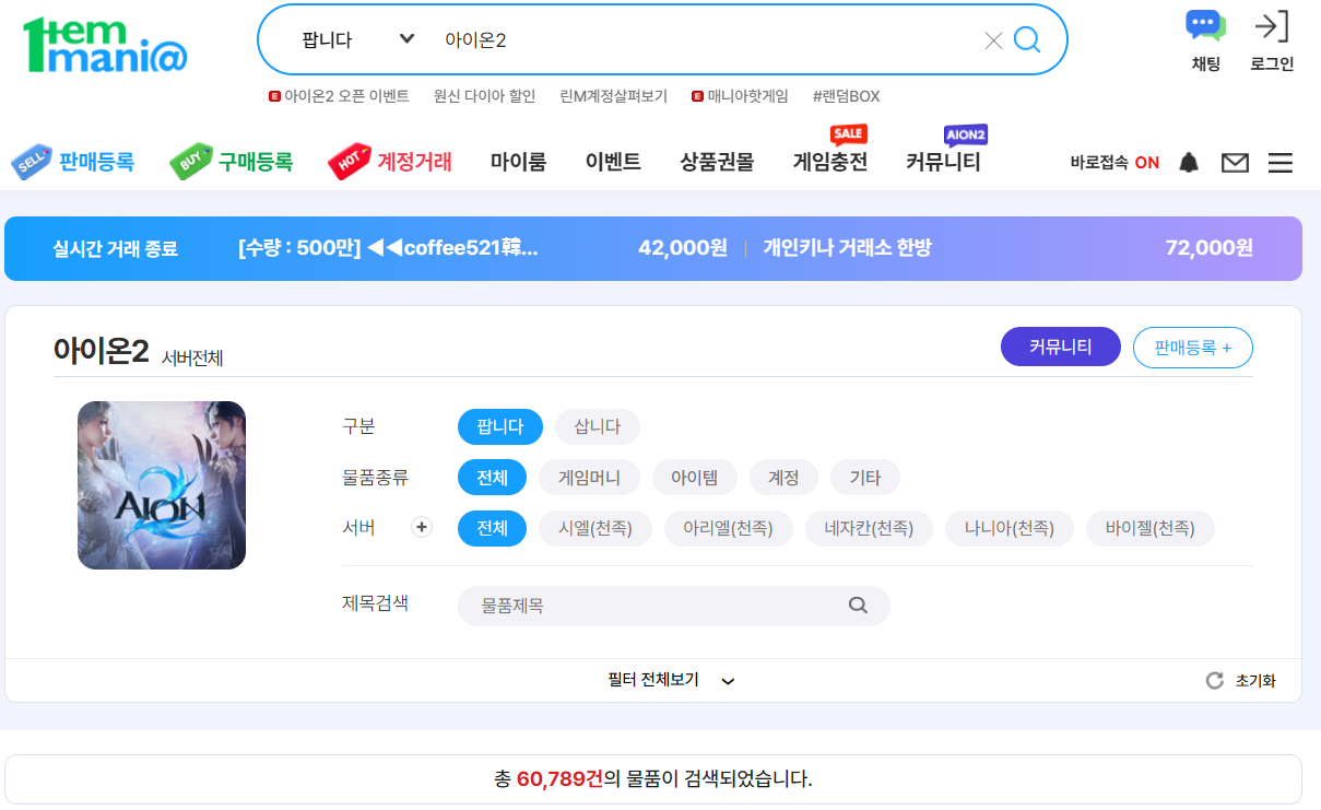 아이온2 출시 후 유저들 사이에서 가장 먼저 화제가 된 건 다름 아닌 계정 및 아이템 거래 폭발입니다. 실제로 아이템매니아에서는 출시 초반부터 희귀 닉네임 선점 계정과 고스펙 캐릭터 계정이 줄줄이 등록될 정도로 거래가 폭발하고 있습니다.
