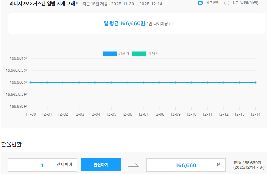 리니지2M 계정 시세는 유동적이므로, 거래 전 아이템매니아에서 최신 매물 리스트와 데일리 시세 그래프를 확인하는 것이 가장 정확하고 안전한 방법입니다.