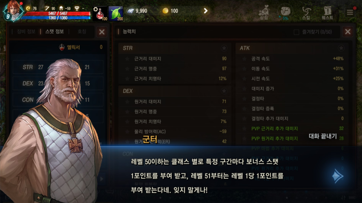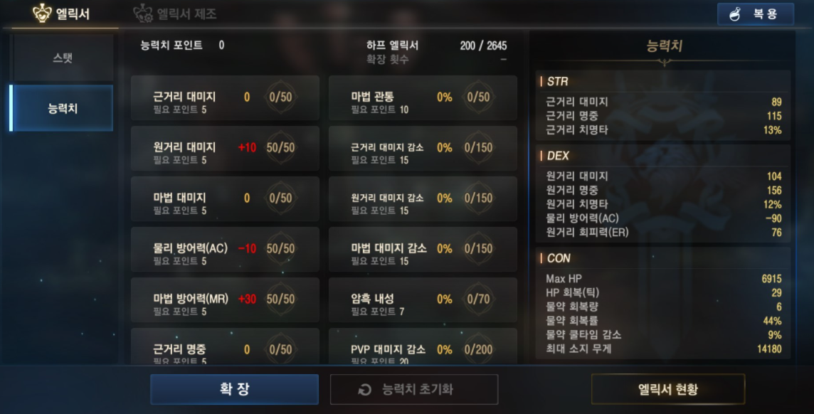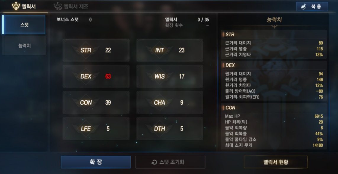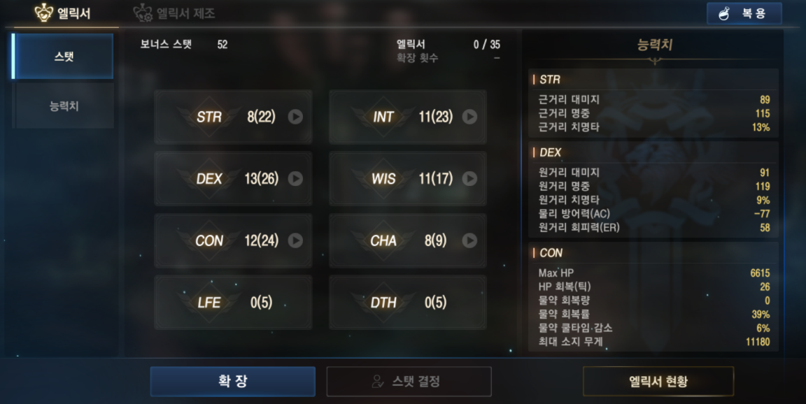 스킬 사용 빈도가 높은 암흑기사 특성상, 남는 스탯은 WIS에 투자하는 방식이 후반으로 갈수록 체감이 큽니다.