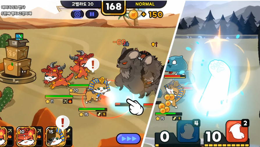 전략적 전투: 3마리의 고양이 조합과 집사가 직접 사용하는 '타워 스킬'의 타이밍이 승부를 가릅니다.