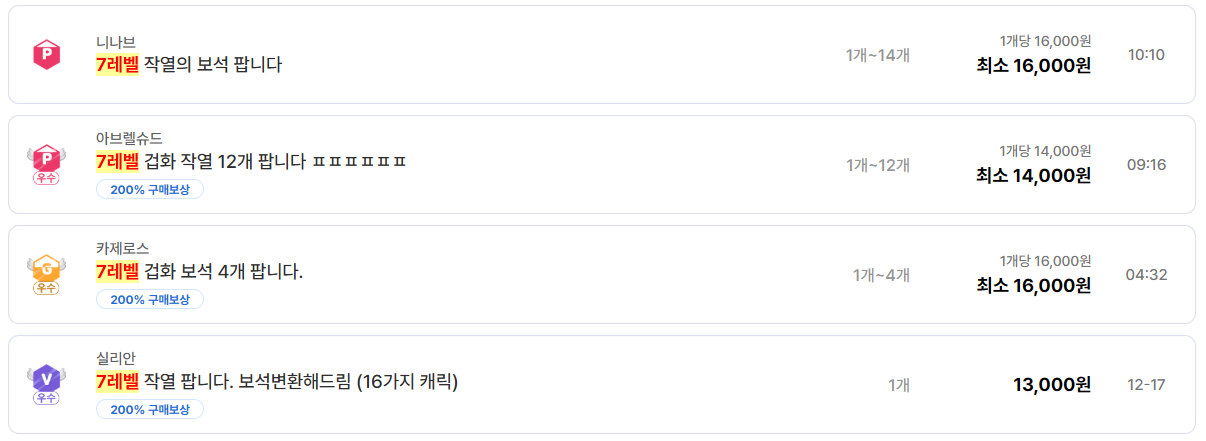 | 7레벨 | 겁화/작열 | 13,000원 ~ 16,000원 | 입문/부캐용 보석으로 저가 형성. |