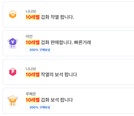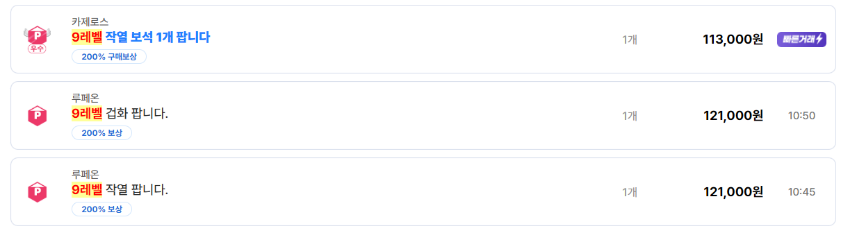 | 9레벨 | 겁화/작열 | 115,000원 ~ 125,000원 | 10레벨 대비 약 3배 낮은 시세. 대량 일괄 거래 시 200만 원 돌파 사례 확인 (9겁작 18개 2,160,000원 거래 종료). |