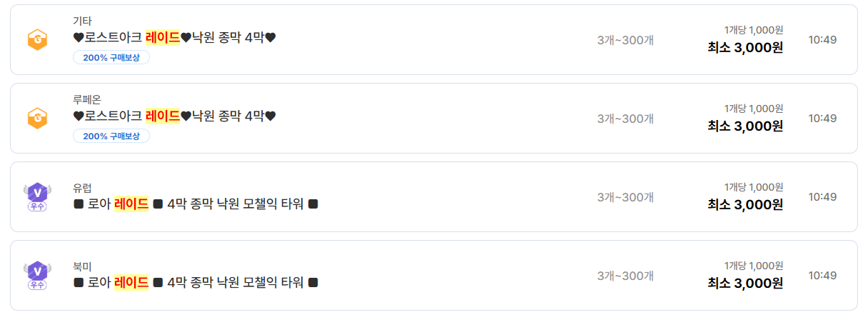분석: 전 서버에서 '낙원 종막 4막' 레이드 대리 광고가 동시다발적으로 올라와 있습니다. 판매자에게는 안정적인 현금 수입원이며, 바쁜 유저에게는 시간을 들이지 않고 주간 숙제를 끝내고 골드/보상을 확보하는 필수적인 시간 구매 서비스로 자리 잡았음을 보여줍니다.