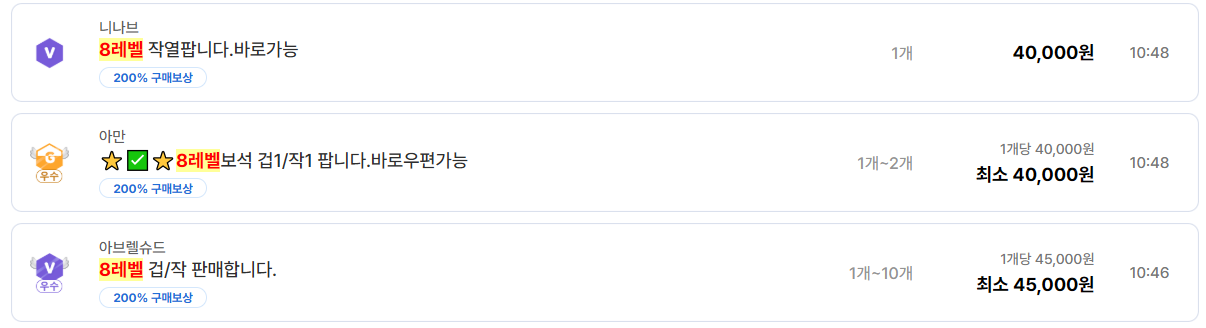 | 8레벨 | 겁화/작열 | 39,900원 ~ 43,000원 | 가장 거래량이 많은 보편적인 스펙업 구간. 4만 원 전후로 시세가 안정적. |