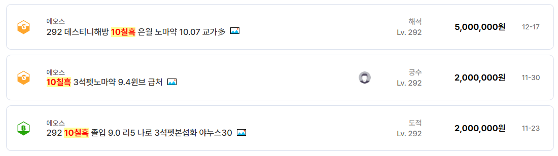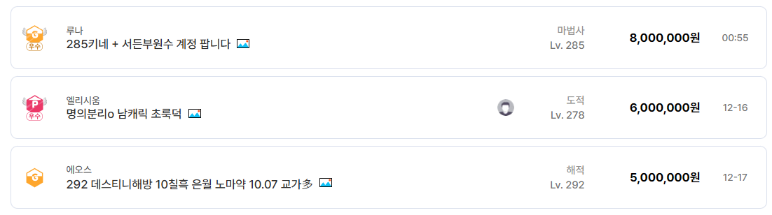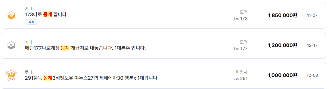 반면 장비가 제외된 이른바 몸계정 시장은 매우 활발하게 돌아가고 있습니다. 280레벨 이상의 고레벨 캐릭터임에도 불구하고 장비가 없거나 내실이 부족한 경우 20만원에서 50만원 사이의 저렴한 가격대에 거래가 종료되는 사례가 많습니다. 이는 신규 유입 유저들이 기반이 마련된 계정을 구매해 직접 장비를 맞추려는 수요가 반영된 것으로 보입니다.