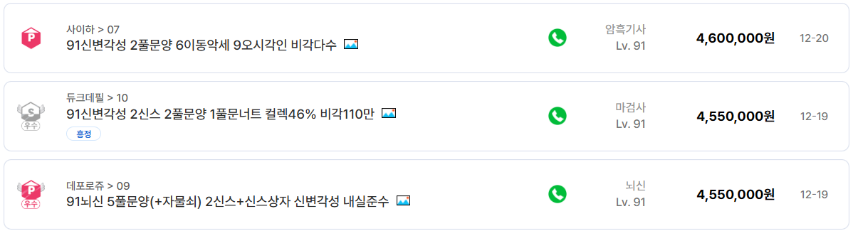 실제 거래 리스트를 보면 90~91레벨 구간의 신화 계정이 가장 많이 분포되어 있고, 가격대 역시 200만 원대부터 500만 원대까지 폭넓게 형성돼 있다. 같은 91레벨, 신화 변신을 보유한 계정임에도 불구하고 가격 차이가 크게 나는 이유는 명확하다. 바로 신스킬, 풀문양, 이동 악세, 내실 수치 때문이다.