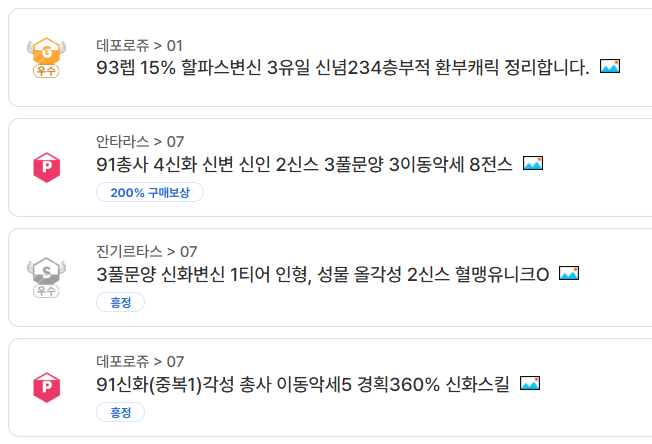 특히 눈에 띄는 부분은 마검사, 사신, 뇌신 계열 직업의 공급 과잉이다. 해당 직업군은 여전히 인기 직업군이지만, 거래 리스트에 물량이 지속적으로 쌓이면서 시세가 빠르게 안정되고 있다. 같은 조건의 계정이 많아질수록 구매자는 선택권이 넓어지고, 판매자는 가격 경쟁을 할 수밖에 없다. 이로 인해 “급정리”, “빠른 거래”, “흥정 가능” 같은 문구가 붙은 매물도 눈에 띄게 늘었다.