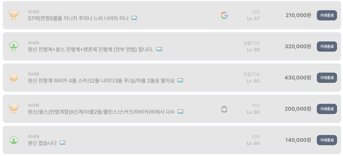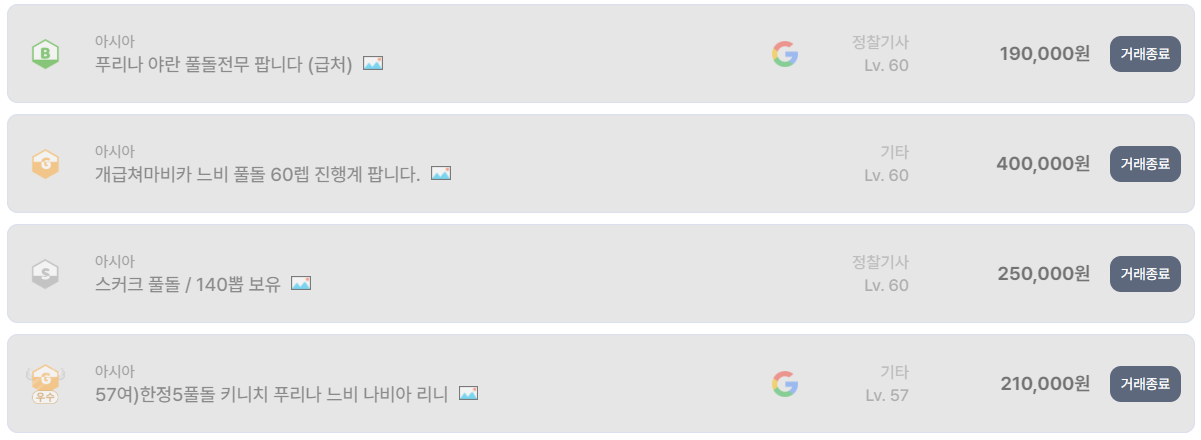 실제 계정 거래 종료 리스트를 보면 이 흐름이 그대로 반영되어 있다. 아시아 서버 기준으로 푸리나, 야란 풀돌 전무 계정이 19만 원에 거래 종료됐고, 스커크 풀돌에 140뽑을 보유한 계정도 25만 원 선에서 마무리됐다. 과거 기준으로 보면 상당히 높은 스펙이지만, 지금 시장에서는 ‘프리미엄’이라기보다는 ‘합리적인 고급 진행계’ 정도로 인식되고 있다.