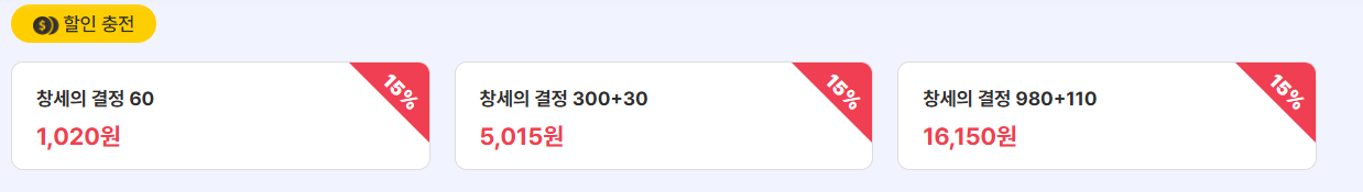 먼저 충전 시장부터 보자. 아이템매니아 기준으로 창세의 결정은 15% 할인 프로모션이 적용된 상태로 꾸준히 거래되고 있다. 60개 소량 충전부터 980+110 대량 충전까지 모두 할인 적용이 가능하다는 점은, 신규 유저나 복귀 유저에게 진입 장벽을 낮추는 요소다. 하지만 이 할인 충전이 활성화될수록, 반대로 기존 고스펙 계정의 체감 가치는 상대적으로 낮아질 수밖에 없다. 직접 키워도 부담이 줄어들기 때문이다.