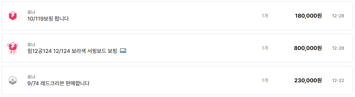 보핑 계열 아이템 역시 고가 거래가 활발하다. 10/119 보핑은 180,000원, 힘12 공124 옵션의 보라색 서핑보드 보핑은 무려 800,000원에 거래되고 있다. 이는 특정 직업군이나 세팅에서 필수로 요구되는 아이템이기 때문에 수요 대비 공급이 부족한 전형적인 고가 구조를 보인다. 레드크리븐 9/74 역시 230,000원에 판매되며 안정적인 시세를 유지 중이다.