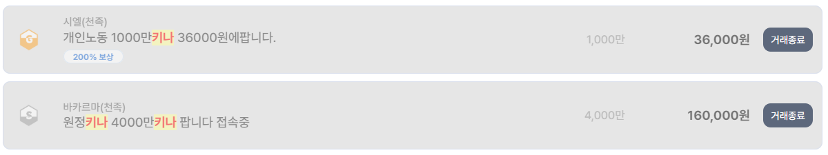 시엘 서버의 경우 100만 키나당 약 4,300원 수준을 기록하며 천족 서버 중 대장주 역할을 하고 있으며 마족의 무닌이나 에레슈키갈은 4,500원대를 방어하며 강세를 보이고 있습니다.