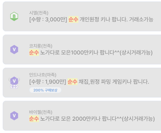 - 순수 개인 파밍 강조: 원정, 암굴 사냥, 채집 등을 통해 직접 얻은 키나임을 강조하는 문구가 많습니다. 이는 매크로나 작업장 키나가 아닌 안전한 재화라는 점을 어필하여 단가를 높게 유지하려는 전략입니다.