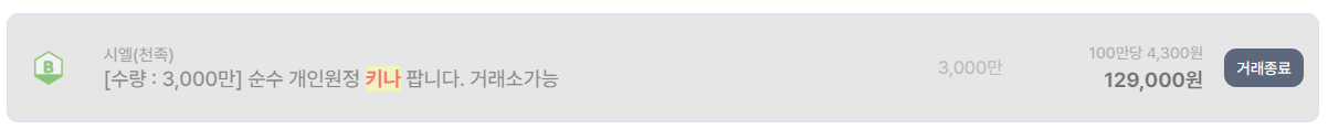 | 시엘(천족) | 3,000만 키나 | 129,000원 | 4,300원 |