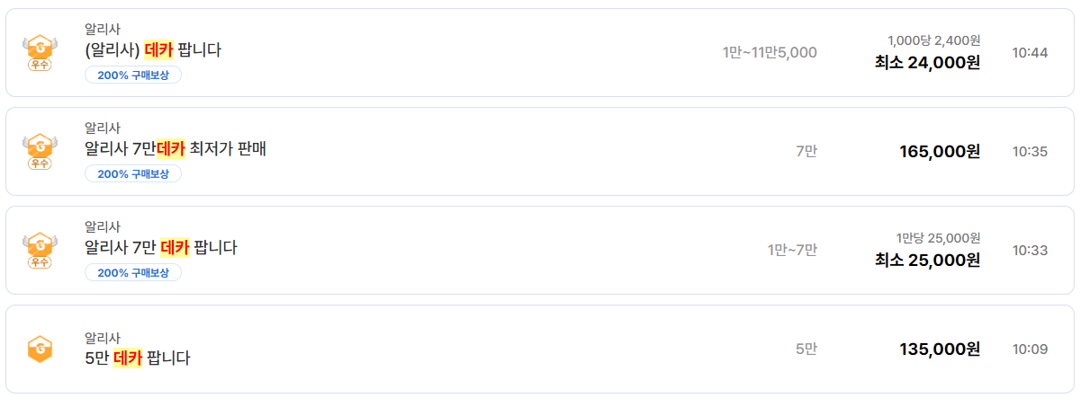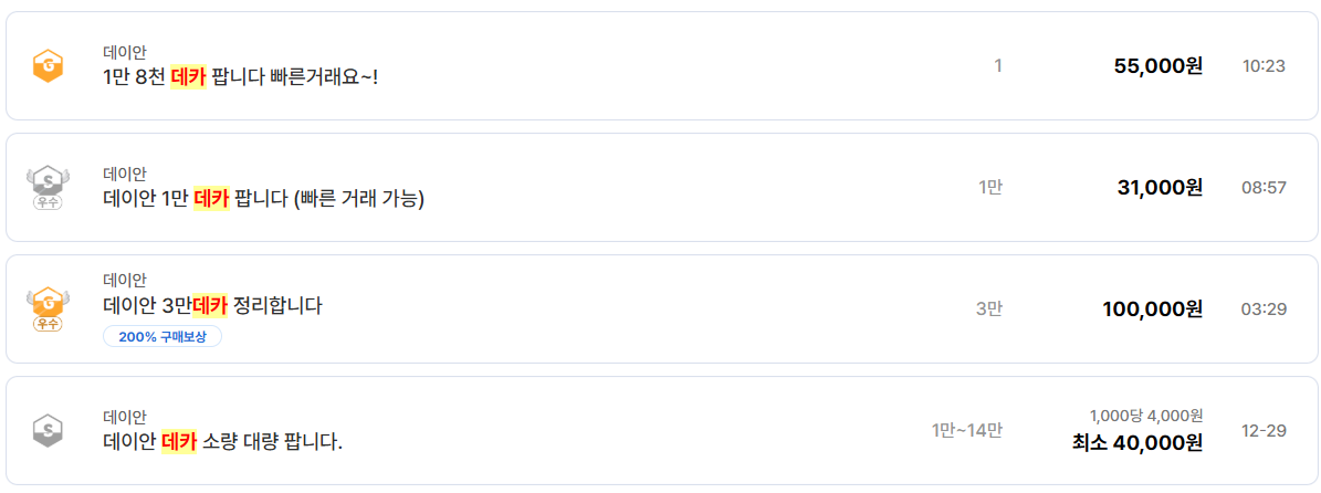 흥미로운 부분은 ‘200% 구매보상’ 문구가 붙은 거래가 매우 많다는 점이다. 이는 구매 안정성을 강조하며 신뢰를 확보하려는 판매자 전략으로 해석할 수 있다. 실제로 동일한 데카 수량이라도 구매보상 여부에 따라 거래 속도 차이가 발생하고 있으며, 초보 구매자일수록 해당 조건이 붙은 매물을 선호하는 경향이 강하다. 이로 인해 보상 조건을 갖춘 판매 글은 상대적으로 높은 단가임에도 빠르게 소화되는 모습을 보인다.