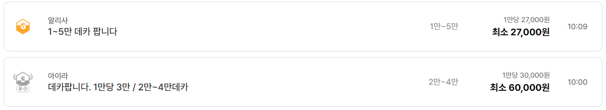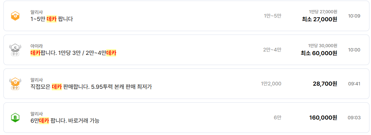 먼저 전체적인 데카 시세를 살펴보면, 현재 시장의 기준가는 1만 데카당 약 2만4천 원에서 3만 원 선으로 형성되어 있다. 가장 많이 거래되는 가격대는 1만 데카 기준 2만5천 원~3만 원 구간으로, 알리사, 데이안, 칼릭스, 아이라 서버 모두 유사한 흐름을 보인다. 예를 들어 던컨 서버에서는 1만 데카가 2만5천 원~2만6천 원에 거래된 사례가 다수 확인되며, 알리사 서버에서는 1만 데카 2만7천 원~3만 원 수준의 거래가 주를 이룬다.