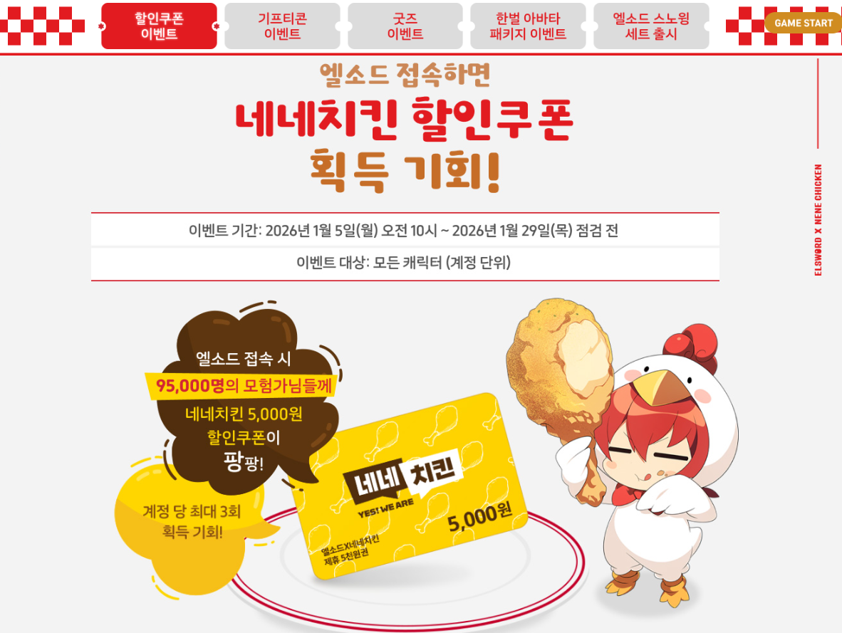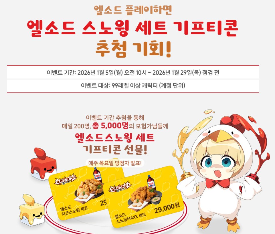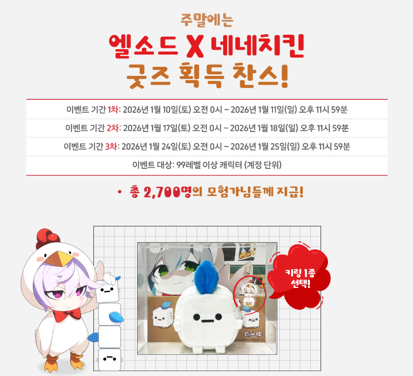 엘소드와 네네치킨의 2026년 콜라보레이션은 게임과 음식이 만나 유저들에게 다각적인 즐거움을 선사하는 모범적인 사례입니다. 맛있는 스노윙 치킨으로 배를 채우고 한정판 아바타로 캐릭터의 개성을 뽐내며 운이 좋다면 귀여운 굿즈까지 소장할 수 있는 역대급 기회입니다.