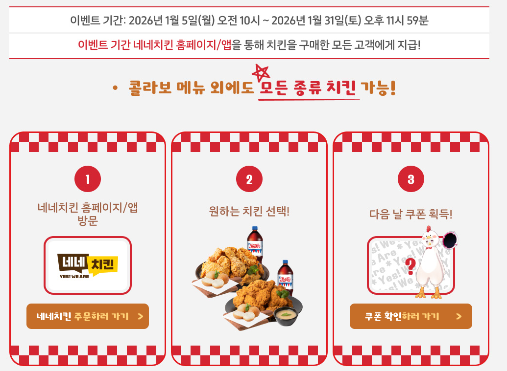 - 주문 경로 확인: 반드시 네네치킨 전용 앱 또는 공식 홈페이지를 통해 로그인 후 주문해야 합니다. 타 배달 플랫폼을 이용할 경우 이벤트 대상에서 제외될 수 있으니 주의가 필요합니다.