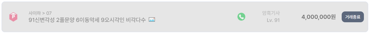 반면 사이하 서버에서 거래 종료된 Lv.91 암흑기사 계정은 전혀 다른 흐름을 보여준다. 신변 각성 완료, 2풀 문양, 6이동 악세, 9오시 각인, 다수 비각성 스킬 보유라는 조건으로 400만 원에 거래가 성사되었다. 같은 암흑기사임에도 수백 배 이상의 가격 차이가 발생한 이유는 명확하다. 즉시 실전 투입이 가능하고, 추가 성장 비용이 거의 들지 않는 완성형 계정이기 때문이다.
