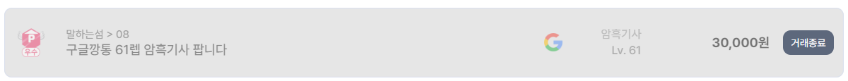 아이템매니아에서 실제 거래 종료된 암흑기사 계정 사례들을 살펴보면, 단순히 레벨만으로 가격이 결정되지 않는다는 점이 명확히 보인다. 가장 저가로 거래된 사례는 글루디오 서버의 Lv.80 구글깡통 암흑기사 계정으로, 2영스 보유 조건임에도 2만5천 원에 거래 종료되었다. 비슷하게 Lv.82 각인 영템 보유 계정 역시 3만5천 원에 마무리되었고, 말하는섬 서버의 Lv.61 계정도 3만 원 선에서 거래가 완료되었다.