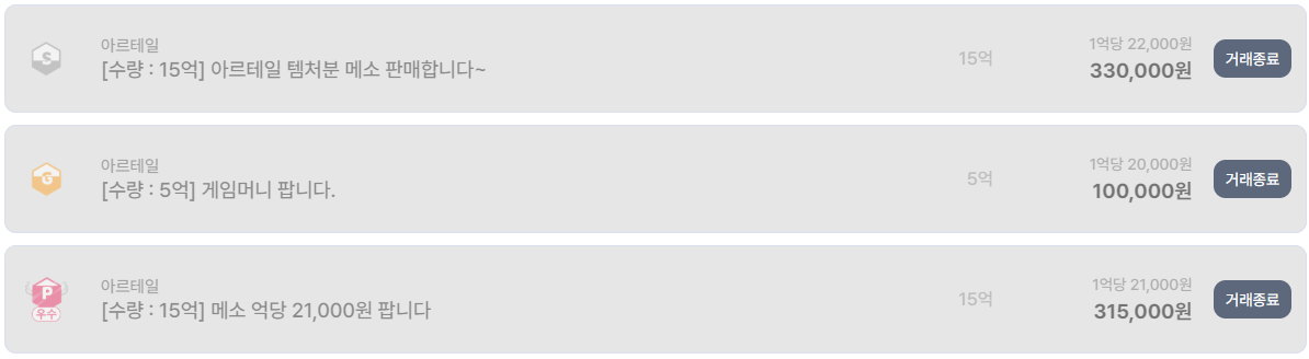 이번 글에서는 아이템매니아에서 실제로 거래 종료된 아르테일 메소 판매 내역을 기반으로, 현재 메소 시세 흐름과 거래 특징을 정리해본다.