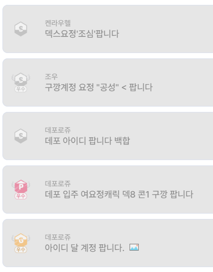 실제로 데포로쥬 서버에서 거래된 요정 캐릭터 ‘만약에’, ‘여우비’, ‘촥’, ‘밸’, ‘햐’ 등은 모두 레벨 1이지만 6만 원에서 8만 원 사이에 거래 종료되었다. 켄라우헬 서버의 기사 ‘악마’ 계정은 50만 원에 거래가 완료되었는데, 이는 닉네임 가치와 서버 선호도가 함께 반영된 사례로 볼 수 있다.