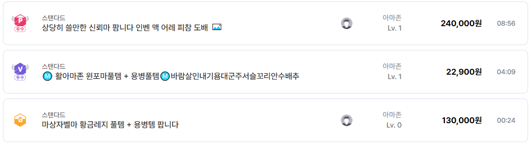 래더 쪽을 살펴보면 시즌 후반부 특성이 그대로 드러납니다. 불사자벨마 풀템 계정이 3만 원 이하로 급처되는 사례가 다수 존재하며, 한때 고가였던 무공·불사조 포함 세팅도 시즌 종료 시점에서는 빠른 정리를 우선하는 흐름이 강합니다. 이는 래더 특성상 시간 가치가 빠르게 하락하기 때문이며, 실사용 목적보다는 소장이나 테스트용 수요로 이동하는 경향이 뚜렷합니다.