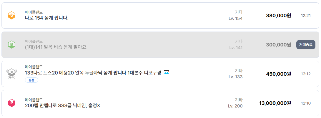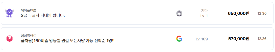 또 하나 주목할 부분은 닉네임 가치다. S급, SS급 두 글자 닉네임만으로도 60만 원 이상에 거래되는 사례가 있으며, 고레벨 캐릭터와 결합될 경우 가격 상승폭이 상당하다. 이는 메이플랜드 유저층이 단순 효율뿐 아니라 캐릭터 아이덴티티도 중요하게 본다는 점을 보여준다.